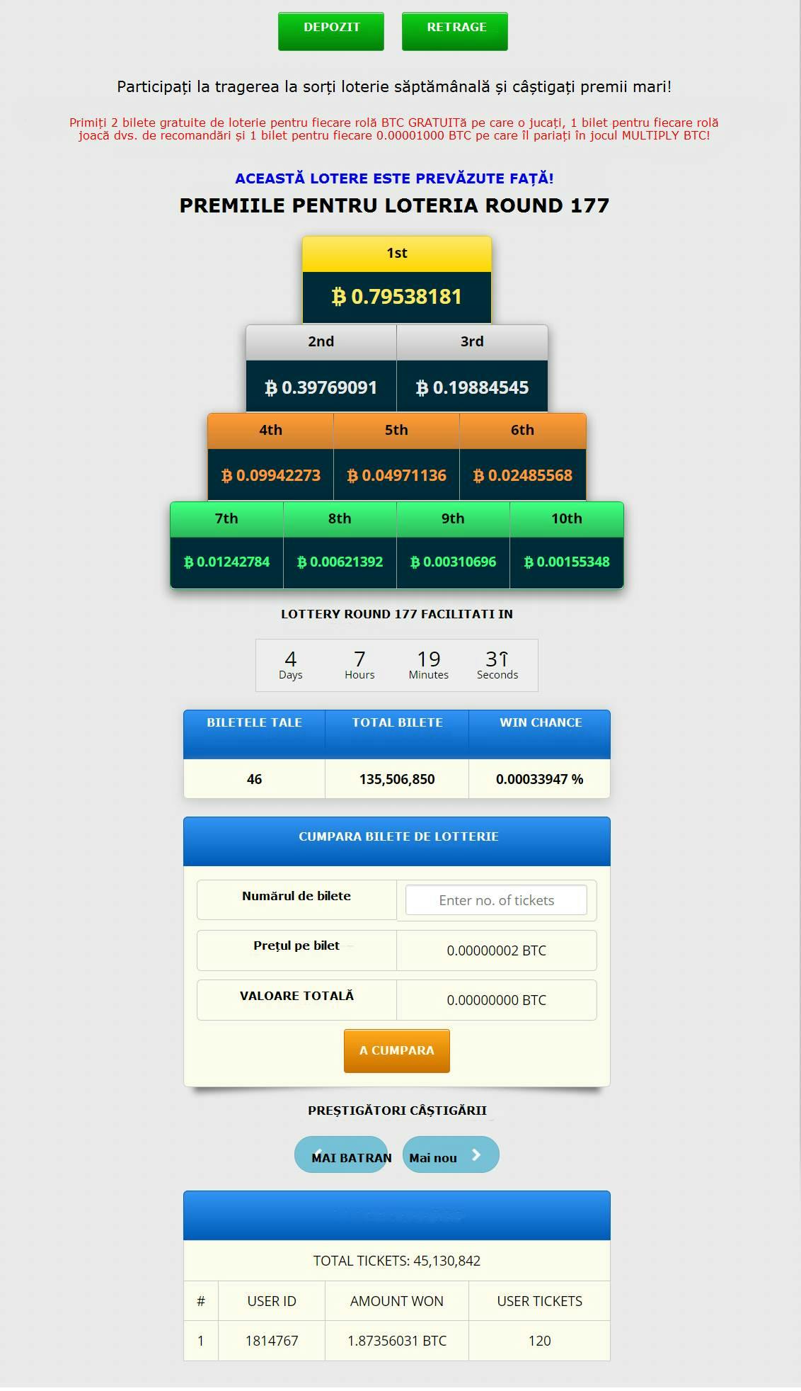 Primiți 2 bilete gratuite de loterie pentru fiecare rolă BTC GRATUITă pe care o jucați, 1 bilet pentru fiecare rolă joacă dvs. de recomandări și 1 bilet pentru fiecare 0.00001000 BTC pe care îl pariați în jocul MULTIPLY BTC!